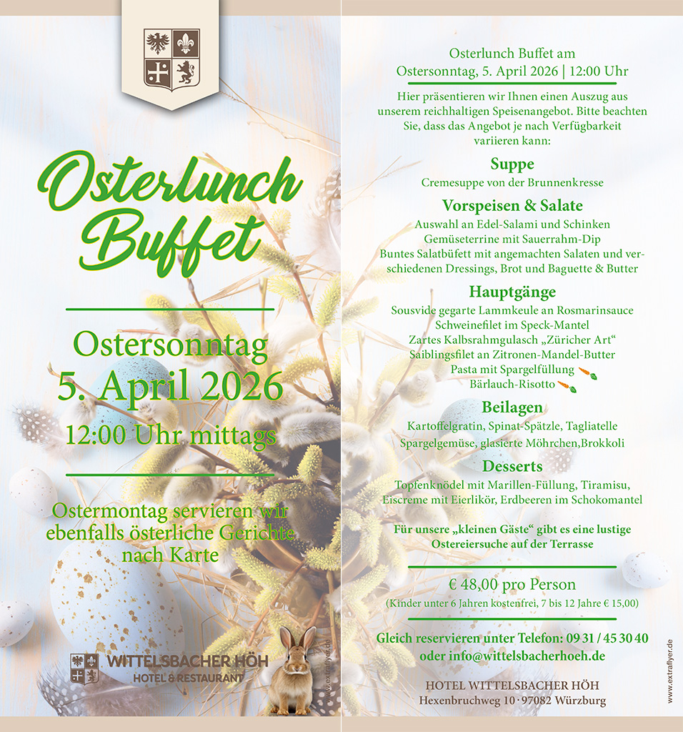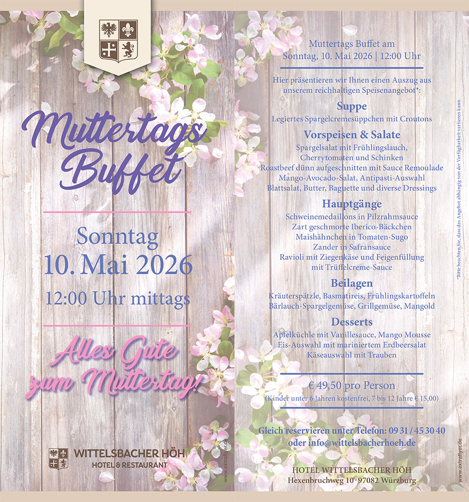 Überraschen Sie Ihre Mutter mit einem Besuch beim Muttertagslunch-Buffet auf der Wittelsbacher Höh. Schlemmen Sie gemeinsam mit Ihren Liebsten nach Herzenslust Vorspeisen, Hauptgerichte und Desserts aus einer feinen Auswahl an leckeren Frühlingsgerichten sowie den traditionellen Klassikern aus dem Wonnemonat Mai.