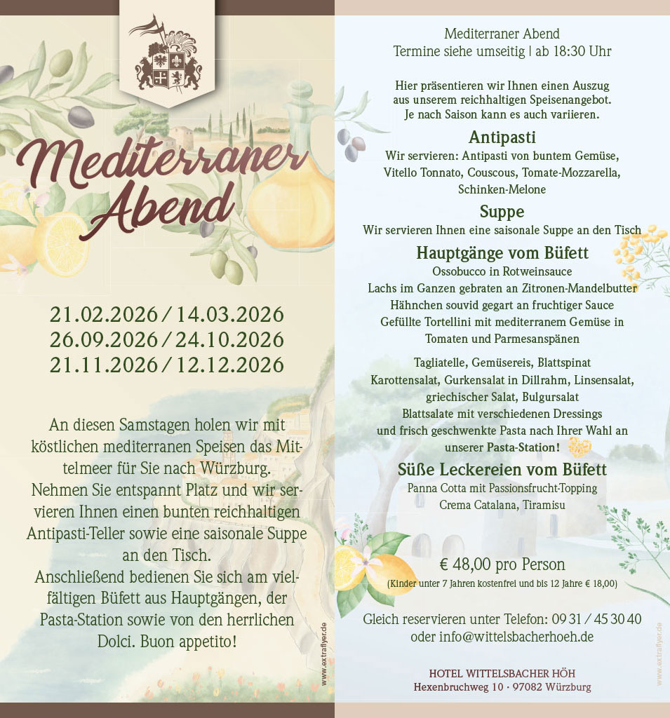 Aus unserem mediterranen Büfett wird ein mediterraner Abend….Nachhaltiger, entspannter, bewusster. Nehmen Sie entspannt Platz und wir servieren Ihnen einen bunten reichhaltigen Antipasti-Teller und auch eine saisonale Suppe kommt an den Tisch. Anschließend bedienen Sie sich an einem vielfältigen Büfett aus Hauptgängen und von der Pasta-Station sowie von den herrlichen Dolci.
